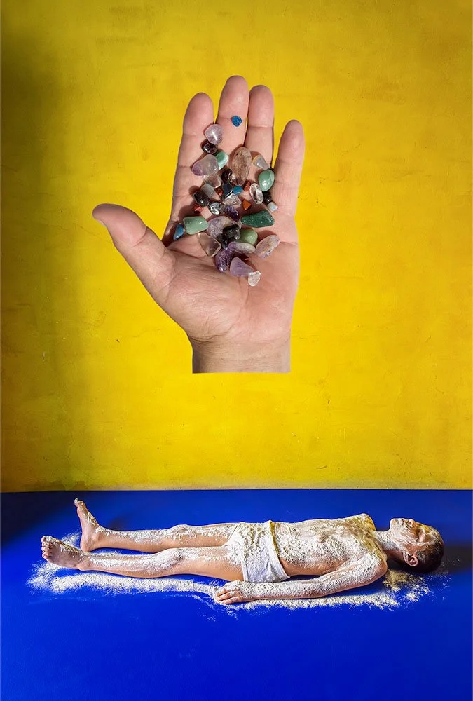 Trujillo’s Mal de Ojo (“the evil eye”) was inspired by his memories of falling gravely ill as a child in Zacatecas, Mexico. When scarlet fever—believed to be the result of a curse—threatened his life and eyesight, his family turned to a local curandero (healer) for protection. The resulting images are split into two parts: fetishistic portrayals of the artist’s trauma and carefully arranged tabletop still lifes of folk remedies, personal amulets, and totems. Often presented as diptychs or triptychs, the works reflect themes of isolation, belief, and resilience.